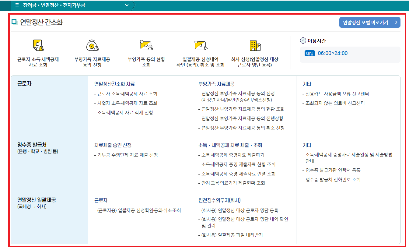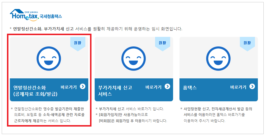 연말정산간소화는 연말정산 기간에 홈택스메인에서 바로 제공됩니다. 영수증 발급기관이 제출한 각종 소득 세액공제 관련 자료를 간편하게 확인하고 발급 받을 수 있기에 필수적으로 사용이 되어집니다.