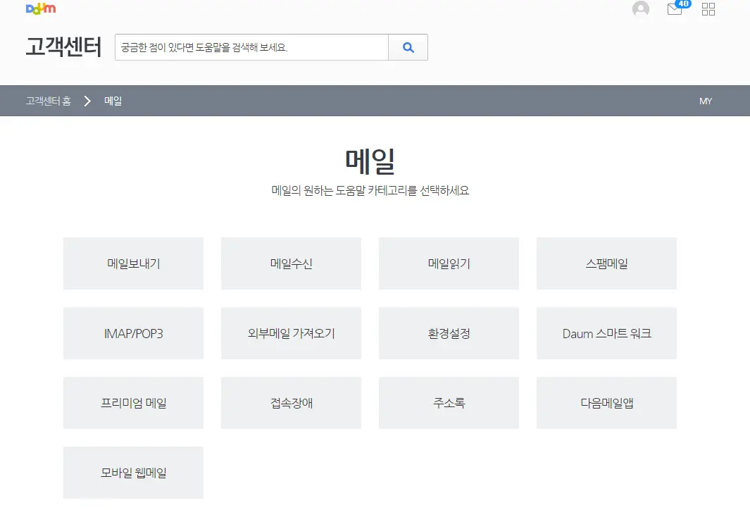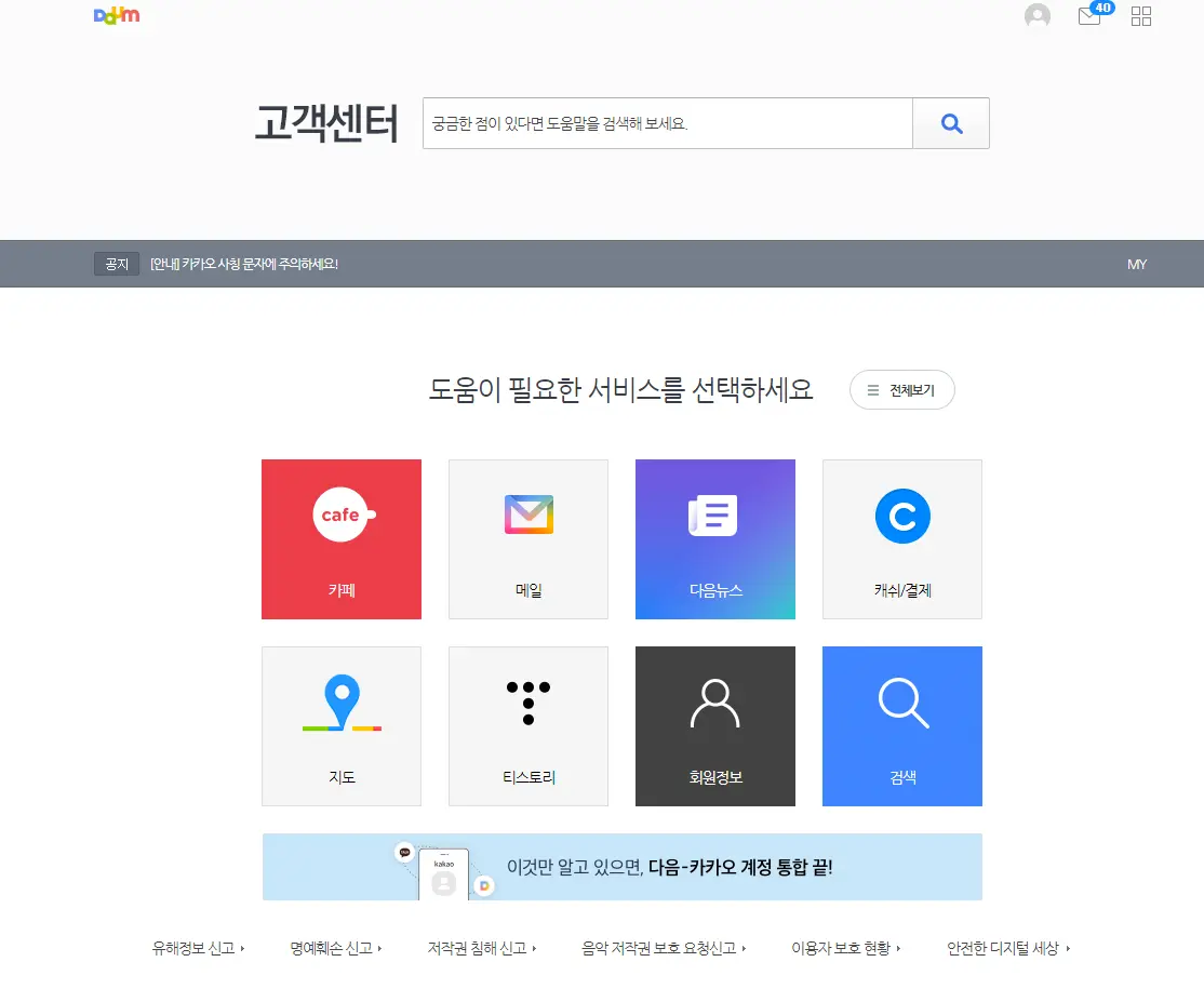 다음 카페, 다음뉴스, 회원정보, 티스토리, 지도, 검색 등에 도움이 필요한 서비스를 잘 확인하실 수 있는 고객센터인데요. 여기에 메일도 있어서 다음/한메일 고객센터를 확인하실 수 있습니다.