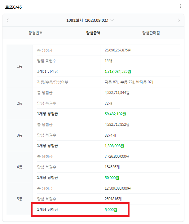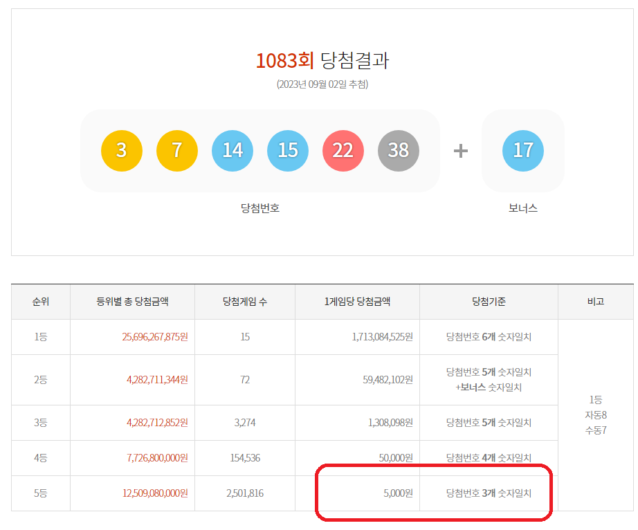 당첨조건을 확인해보면 로또숫자를 3개 맞추게되면 5등이라고 합니다. 그러면 5등에 해당되는 당첨금을 받을 수 있는데요. 5등은 로또의 가장 낮은 등수이며, 당첨금은 5천원이라고 합니다. 즉, 로또 한 번 시도의 가격이 천원이므로, 3개를 맞추면 5번 시도를 하여 본전을 걷는 정도입니다.