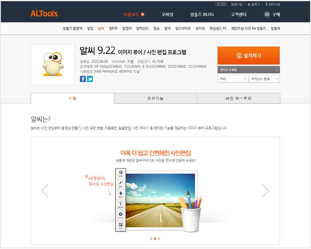 알씨 프로그램은 현재 ALTools를 통하여 온라인으로 정식배포가 되고 있습니다. 때문에 다른 곳을 들릴 필요없이 공식다운로드센터를 통하여 바로 받아서 설치를 진행하십시오.