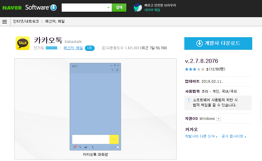 컴퓨터용 카카오톡의 다운로드는 공식홈페이지를 통해서 카카오에서 정식적으로 제공하고 있습니다. 따라서 다른 플러그인이나 소프트웨어를 사용하지 말고 오피셜한 프로그램을 받으셔서 이용하셔야 합니다.