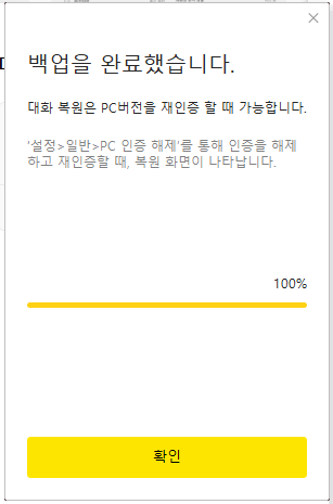백업과 복원 기능을 사용하기 위해서는 먼저 카카오톡의 설정에서 백업 기능을 사용하셔야 합니다. 카카오톡 PC버전에서는 톱니바퀴 버튼을 통하여 설정으로 들어가서 채팅 메뉴의 '대화 백업하기'를 클릭하고 비밀번호를 설정하면 됩니다. 이렇게 설정을 한 백업 데이터는 14일 이후까지 복원이 가능합니다.