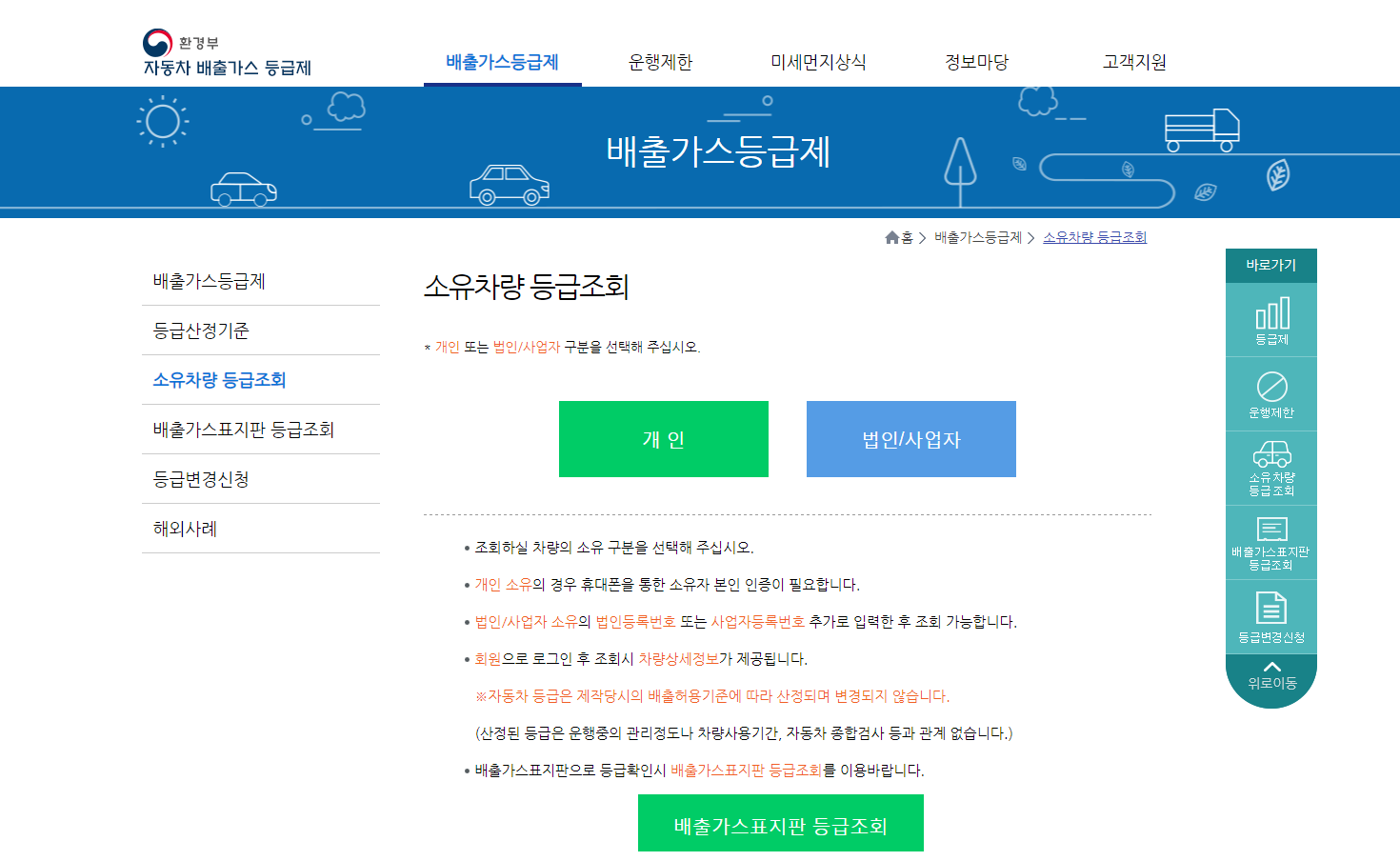 홈페이지를 통하여 배출가스 등급제에 관련된 내용이 확인이 되어지고 있는데요. 여기에서 등급제를 통하시면 등급산전기준, 소유차량 등급조회, 배출가스표지판 등급조회, 등급변경신청 등이 가능합니다.