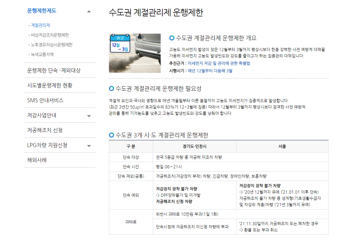이 중에서 5등급의 차량 같은 경우에는 저공해 사업으로 인하여 운행제한이 되어진다고 합니다. 계절 관리제로써 매년 12월 부터 3월까지 4개월이 시행이 되어진다고 하구요. 이를 지키지 않을 경우에는 과태료를 물게 된다고 합니다.