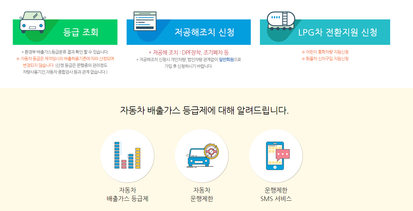 환경부에서는 자동차 배출가스 등급제 홈페이지를 통하여 등급 조회 및 저공해조치 신청, LPG차 전환지원 신청 등을 제공하고 있습니다. 더불어 자동차 운행제한이나 미세먼지 상식을 비롯하여 배출가스 등급제에 대한 다양한 정보를 온라인으로 제공하니 확인을 해보시기 바랍니다.